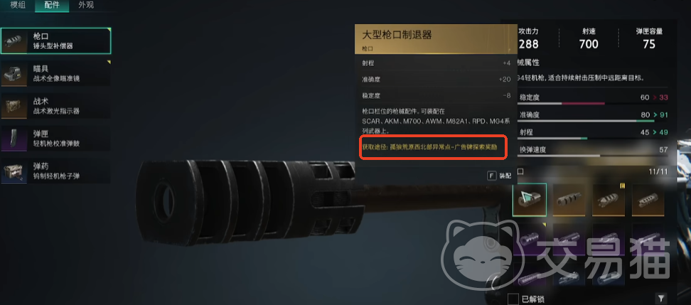 消焰器,坐标4504,-7610;绝路探索奖励,可以看到地上有紫光,交互后根据提示完成小游戏,只要分数足够了就可以得到配件。