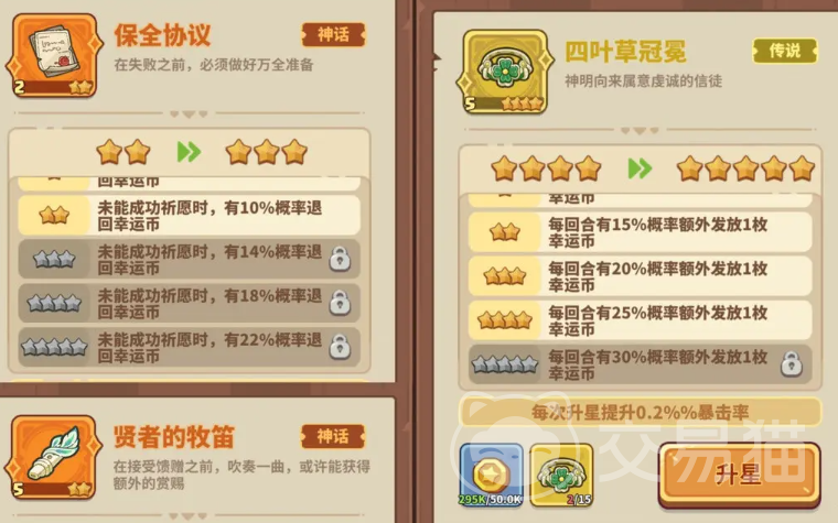 有四叶草、贤者牧笛,卡80任务后概率得到幸运币,直接祈愿紫色英雄,不管祈愿得到什么都先保留。强化概率等级先不要点。看条件,如果能在早期就击败第6波的小boss再好不过,如果不行则要召几个英雄来过渡一下,第10波也是同样的道理。不论是单人局亦或者是联合局,前面10波大多是有一些“福利怪”的,战力高的玩家甚至都不需要召唤什么,直接领主就能通,得到的祈愿币都拿来祈愿紫色英雄。