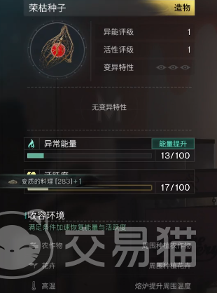 基本上难度越高,出现荣枯种子的概率也随之增高,而且所获取的异常物等级也会越高,荣枯种子的收容环境需要花卉、农作物和高温,建议大家在它周围建造熔炉提升周围的温度,摆上农作物和花卉加快能量回复与活跃度。
