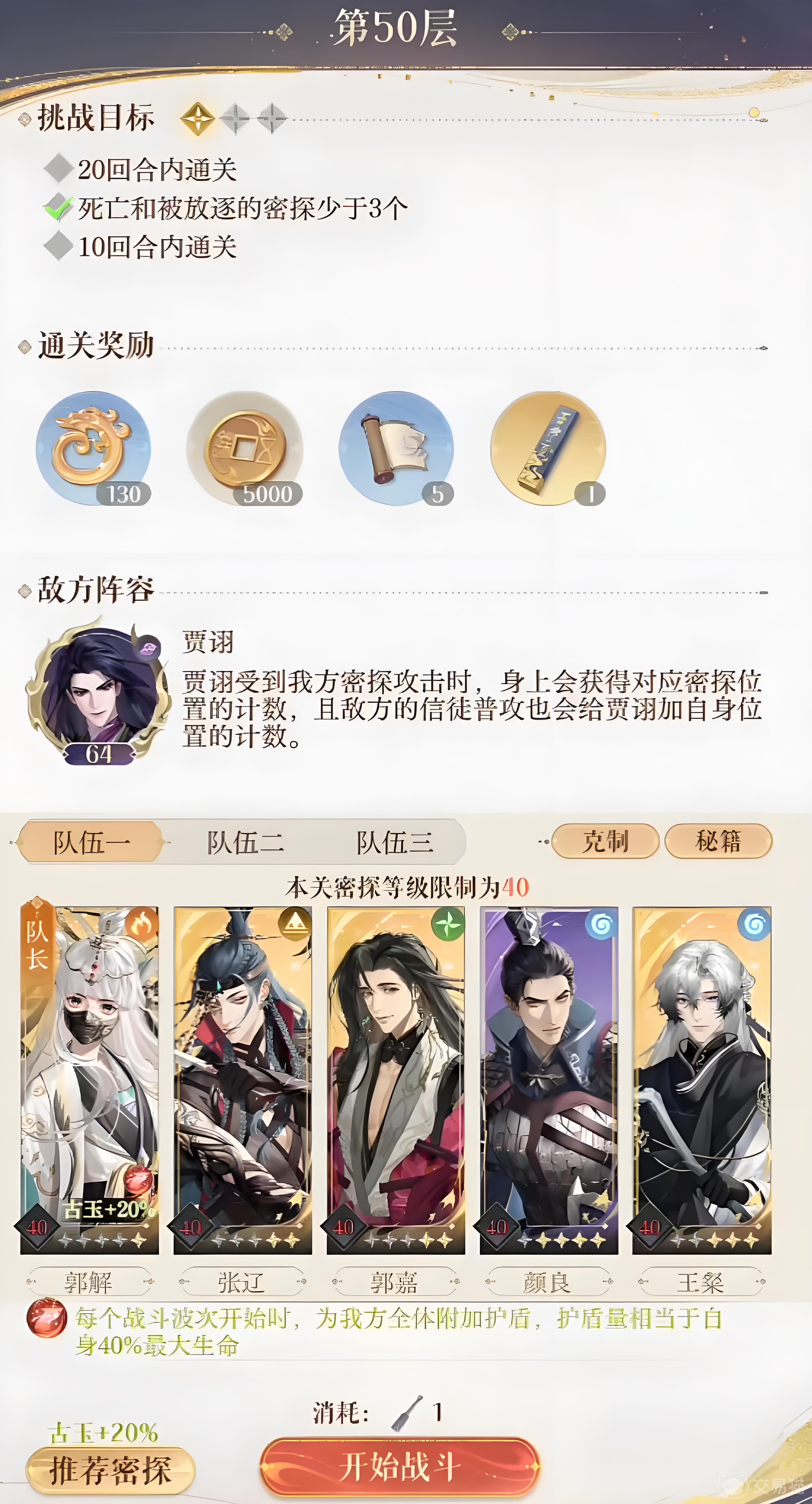 这一层的敌方boss是64级的贾诩,他的特性是每次攻击时都会进行占卜,吉时召唤出2个小怪,凶时退场一个小怪。受到我方攻击时,身上会出现对应密探的位置计数,他的小怪攻击时也会给贾诩加自身位置计数,同时boss的血量非常高。本关限制密探等级为40。