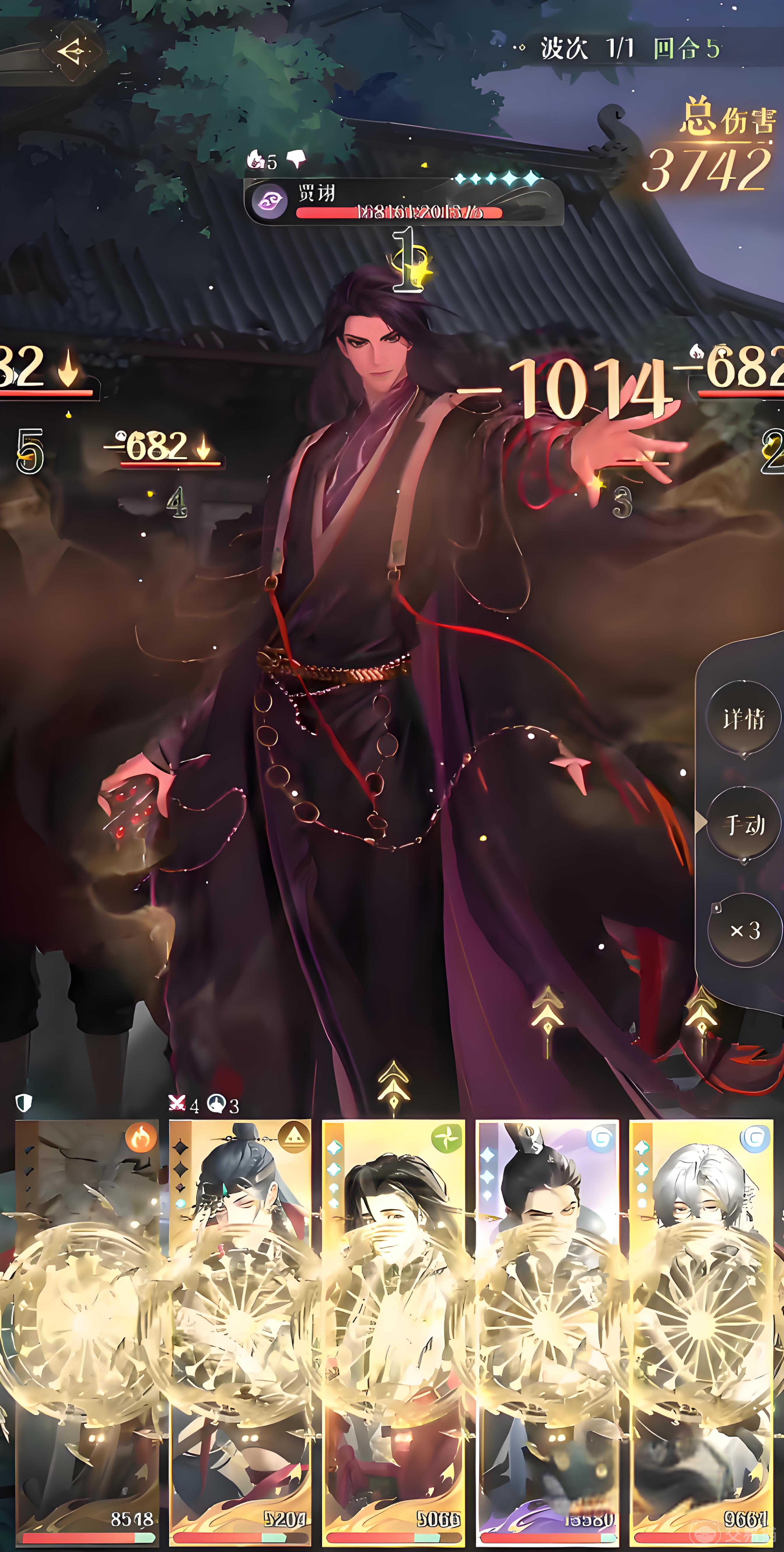 小编推荐的阵容是:王粲+张辽+郭嘉+颜良+郭解。推荐郭嘉是因为他是最好的诡道密探,输出两次攻击就能让小怪都退场。首先第一回合,看场上有没有小怪,有的话王粲下拉防御,其他人普攻。第二回合boss继续召唤两名小怪,数值是4或者5,在1~3位置的密探先攻击一下,剩下两个角色下拉防御,注意及时回血。循环上面的步骤,每次凑够15,一直消耗boss的血量。第5回合在贾诩准备放大招的时候,龙盾角色开嘲讽大招攻击,其他角色防御,boss挂了专注打小怪就好了。