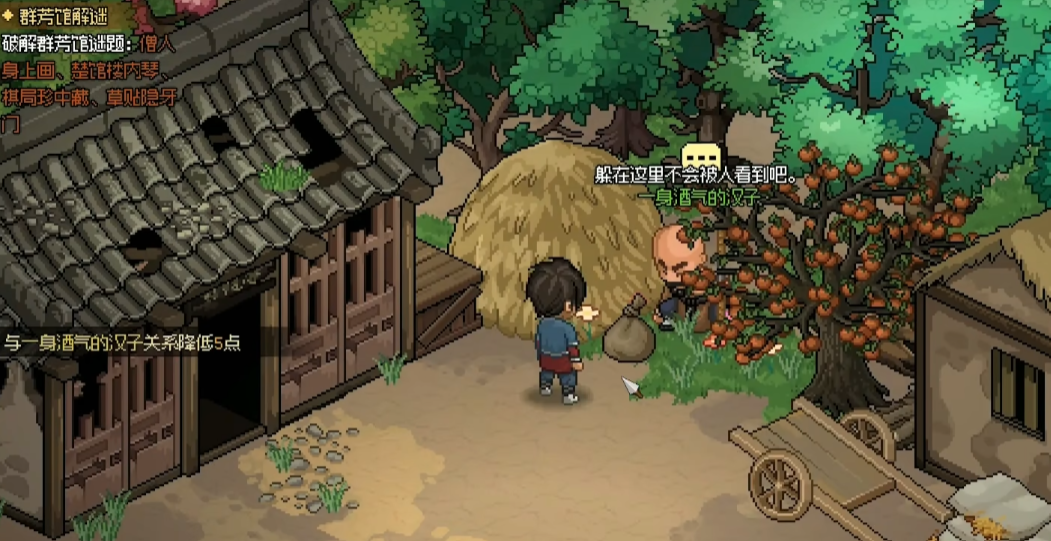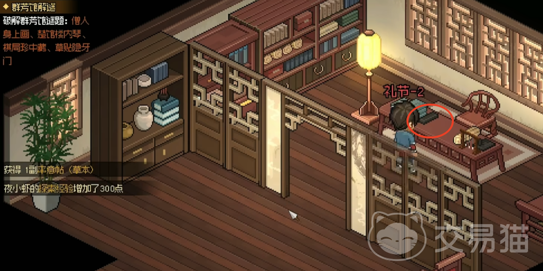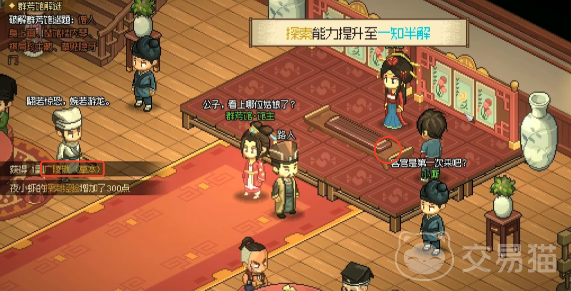 交了10贯押金后后,馆主告诉玩家四个谜题分别是:僧人身上画、楚馆楼内琴、棋局珍中藏、草贴隐牙门。需要玩家找到这四件物品,并将其交给馆主就可以。