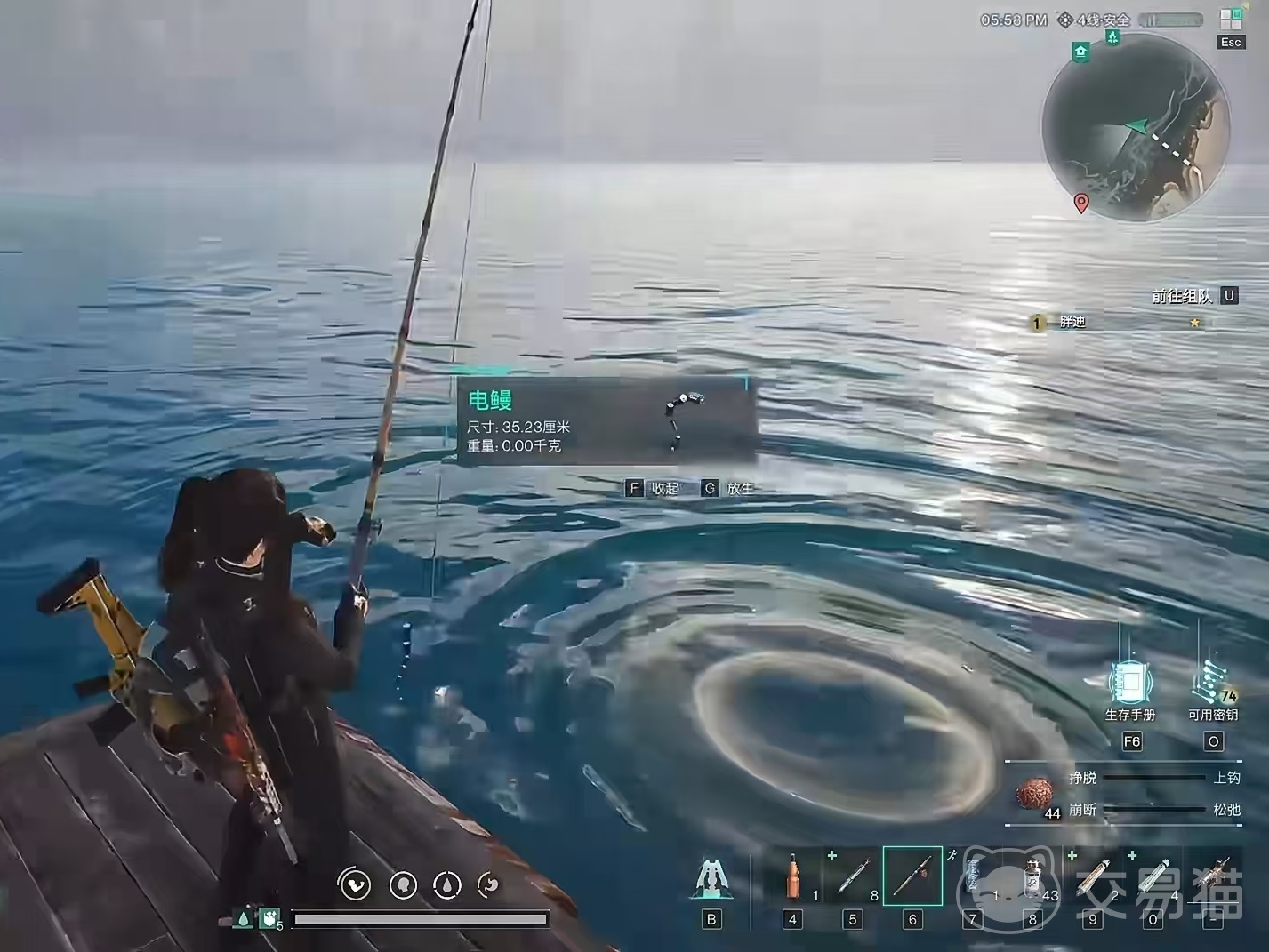 然后走到旁边可以看到有三个钓鱼台,找到一个钓鱼台之后。去钓鱼就可以了,因为这里。与一种是梭鱼,另外就是电鳗。而且这里的电鳗品质比较高,至少都是3-3的电鳗,还有可能出现更高品质的电鳗。大家打开电鳗之后就可以看到有相应的属性,包括异能评级和活性评级以及变异特性等,前面两种评级非常重要,可以提供更高的电力。
