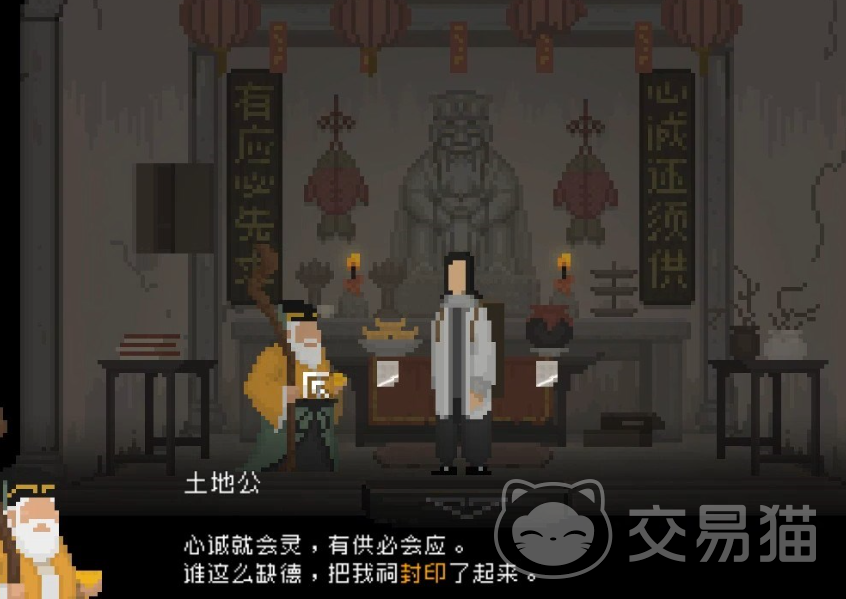 返回土地祠,根据其内符号打开封印,进入后打开左侧的柜子可以得到纸元宝,再从供奉台的左边位置拿到村民的名单,离开土地祠进入旁边的茶铺,先调查墙壁上的杆秤,确认好四个符号砝码的重量,这里注意小提的刻度单位是1,大提的刻度单位是5,调查茶铺的柜子能得到道具半坛酒,前往酒馆对屋外面的酒缸使用这个道具,能得到新的道具一坛好酒,返回土地祠,将之前拿到的纸元宝放入左边的供品盘,酒放入右边的供品盘和土地公对话,就能得到兔形钥匙。