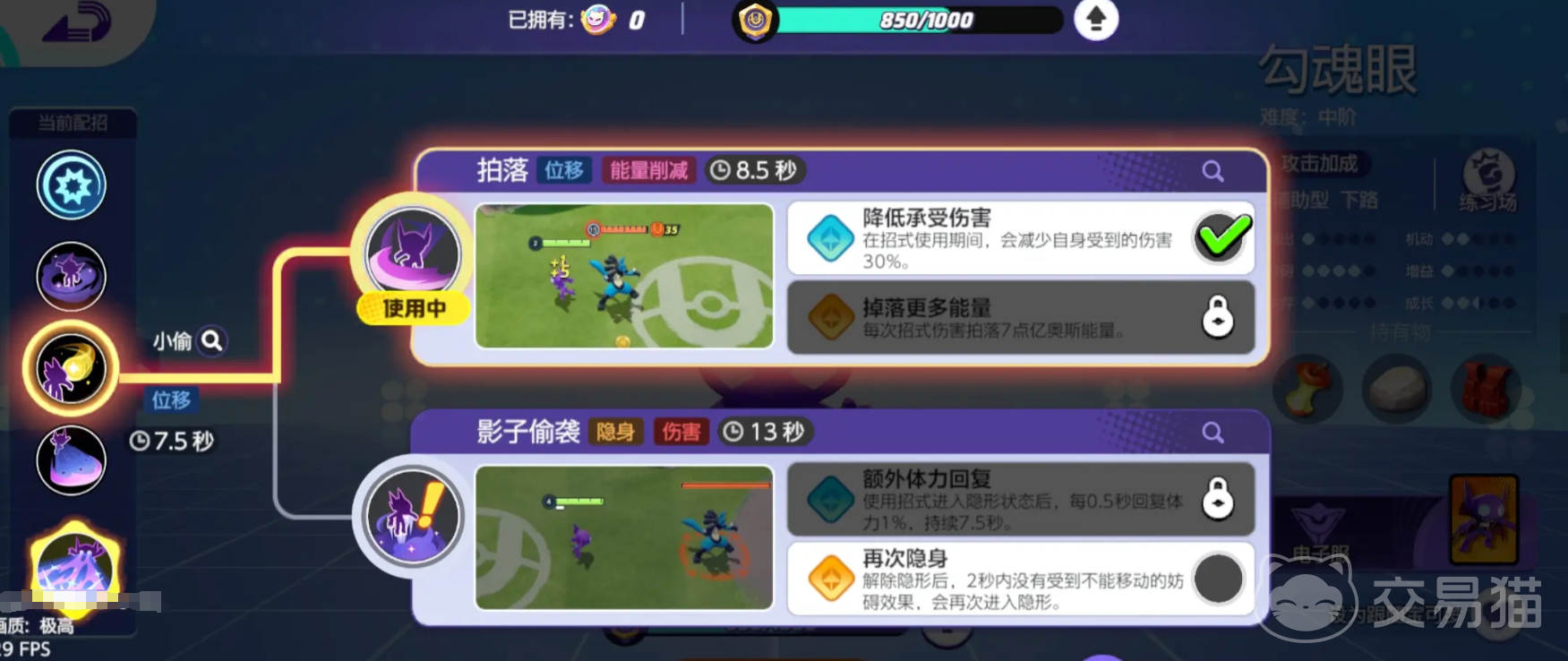 先来看它的被动技能如何使用,“恶作剧之星”作为该宝可梦比较核心的特性,在它离开了敌方的视野之后,就会进入到隐形状态,并且会提高移动速度,而再次进入到对手的视野时,是不会被立刻发现的,会保持一段时间处于隐形状态中,该特性效果就让它在对局时有非常高的机动性,同时隐蔽性也很强,可以在敌人毫无察觉的情况下接近对手,或者是顺利的完成撤退。