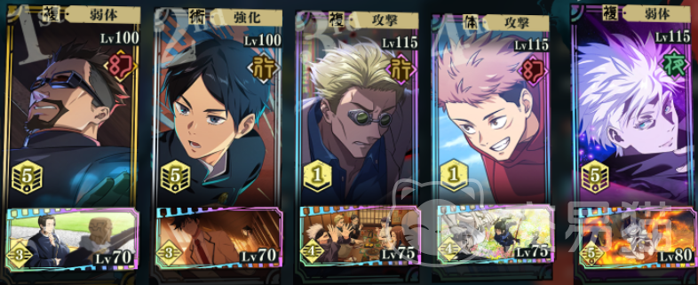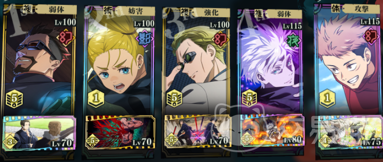 这个游戏里持续多个回合的buff是可以叠加的,因此3辅1C算是比较主流的阵容搭配,根据主C的输出形式,是体术还是术式为主的,然后选择相应属性加成的辅助,再配一些增伤、易伤辅助,将主C的伤害提到最大。那么辅助要怎么选择呢?关键是选增益效果不冲突的,比如说西宫桃(影)+夜蛾正道(幻)+七海建人(幻)+五条悟(夜),援助角色用虎杖悠仁(幻)。
