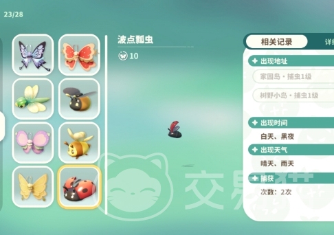 波点瓢虫的出现地点是家园岛和树野小岛,在这两个岛上出现的几率非常大,种类也非常多,大家可以优先在这两个岛上进行抓捕,在抓捕的时候是没有时间上的限制的,因为波点瓢虫全天都会在这个岛上活动,白天和晚上都可以看到他们活动的身影,去抓捕的时候建议玩家在晴天或者雨天去抓捕,因为在这种天气中抓捕的效果会非常的好,每天玩家可以去抓捕两次,如果抓捕不到的话,需要第二天继续抓捕了。