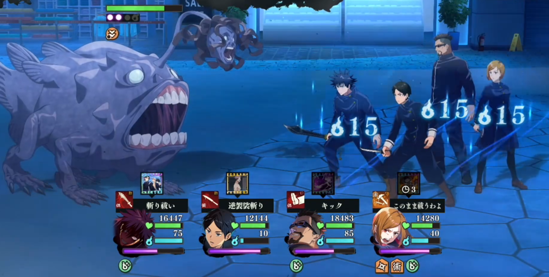 首先来了解下引诱的战斗机制,他是有五个技能循环:1.随机单体40%。2.2900aoe+降30咒debuff。3.随机单体连击*3。4.24db的aoe。5.6900aoe。其实对于这种有特定技能顺序的咒灵来说,打法还是相对简单的观察并记住它的攻击顺序可以帮助玩家预测并准备下一步的行动。