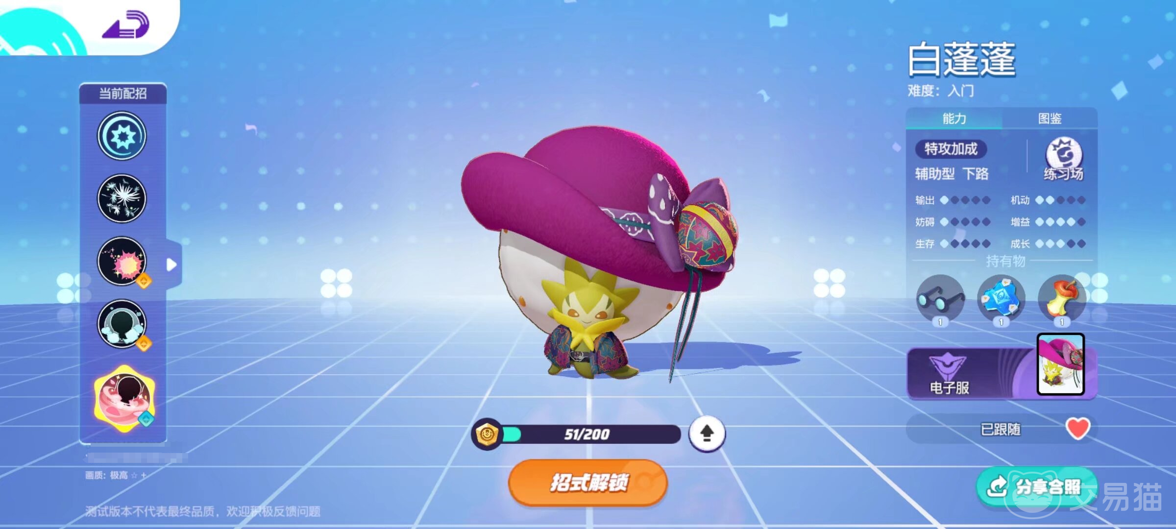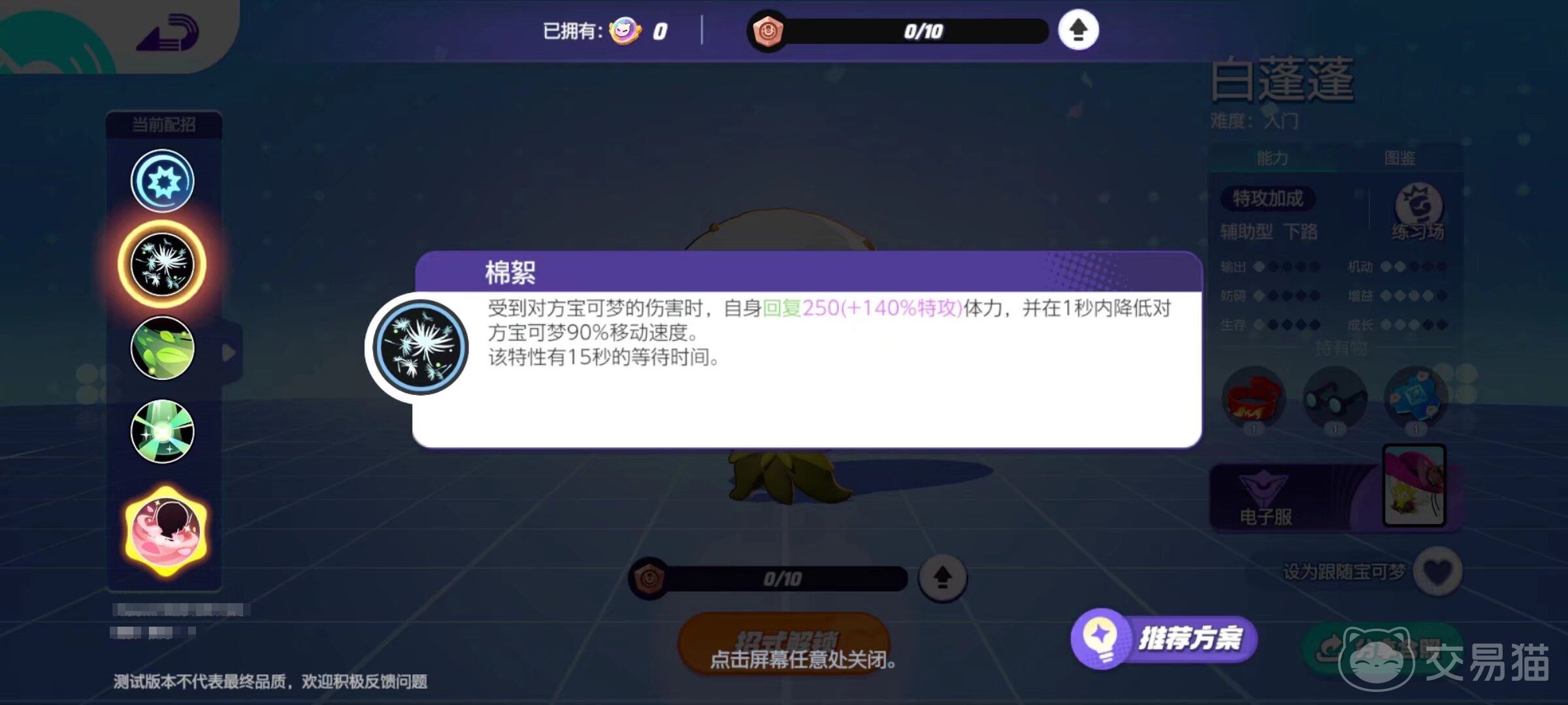 白蓬蓬作为一个辅助系的角色,是游戏里比较偏向群体治疗的辅助,不同的配招对于角色来说会产生细微的变化,比如它,一般适合它的配招就是治疗,增益,以及干扰,作为入门级别得到宝可梦,小伙伴们可以将它提供续航的“治疗”作为主要的发展方向。它的特性在受到敌方的攻击时可以恢复体力,并且让敌人的移动速度降低。