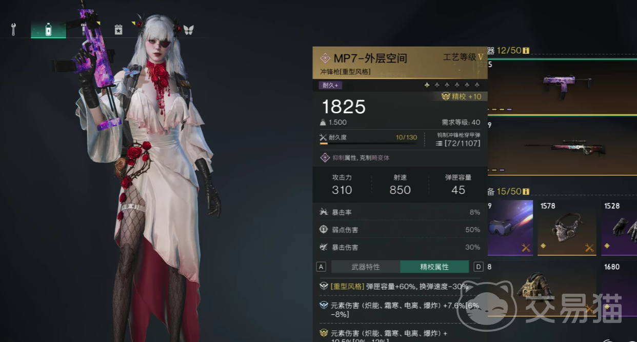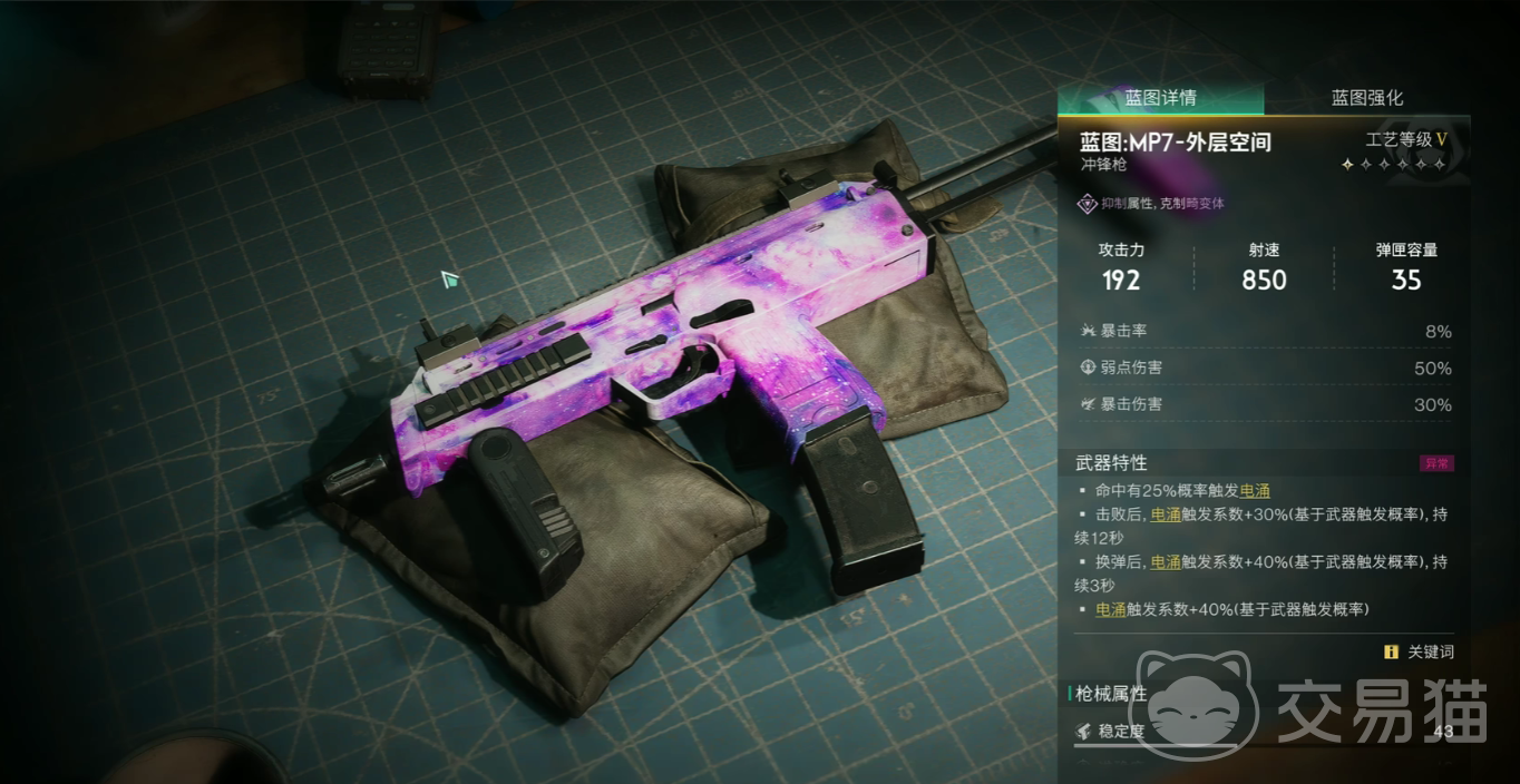 外层空间的具体数值如下,攻击力基础为192,射速为850,弹夹容量为35,附带有8%的暴击率以及50%的弱点伤害,暴击伤害的数值为30%,每一次的攻击命中都有25%的概率触发雷电属性的伤害,在连续攻击达成之后,电属性的伤害会累加debuff,给敌人附加每秒钟降低1%血量的状态,该状态的为序时间是十秒钟。