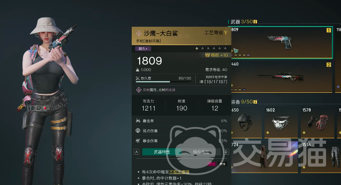 在内测阶段,大白鲨这款手枪被很多玩家们誉为当之无愧的神,作为一款橙色高工艺的宿舍风手枪,它的攻击力高达1211,射速高达190,并且弹夹容量达到12可以进行连环性涉及伤害,并且每四次命中可触发不稳定爆破,而在击败敌方后,爆炸元素的伤害率还会增加30%,且该伤害比率的持续时间高达12秒。可谓是稳坐T0。