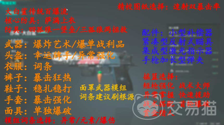第一个流派是大白鲨传统百爆流,这个流派的使用频率还是非常高的,具体的配装方法小编在下方的图片当中也进行了详细的展现,大白鲨这把枪支的核心防具可以更换成萨满上衣,也就是说想玩儿大白鲨就需要花上16000,来购买核心防具,而在防具的选择上就比较多了,可以选择四孤狼一堡垒或者是三孤狼两拯救,这种普通流派的话,普通玩家还是可以考虑的。模组词条的话,小编从武器,头盔,衣服,裤子,鞋子,手套,面具等方面都进行了详细的汇总,小伙伴们可以直接在下方进行浏览,而小编提供的这一套可谓是非常经典的一个百爆流配装方式。不过需要提醒小伙伴们的是,武器装备中要想使用爆单战利品的话,需要玩家先将弹夹叠到20以上才可以开始,其词条当中必须出现弹夹容量这个词条。