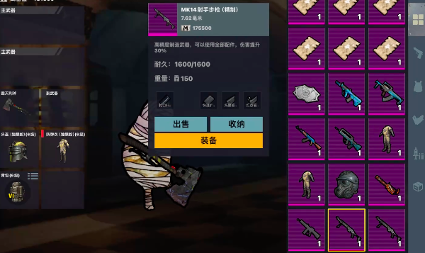 近战武器可选择毁灭利斧,Boss屠夫掉落的专属武器装备,其重量仅有75,玩家想要获得该武器装备可以直接找屠夫。第一把主武器可以选择mk 14精致射手步枪,该武器装备的高精度制造武器可使用全部配件伤害提升30%,而配套的使用子弹建议选择7.62mm子弹且附带一定的毒性是最好的,可以提升70%的伤害,225点护甲穿透性并且附带毒气效果,将附带数量拉到最大。