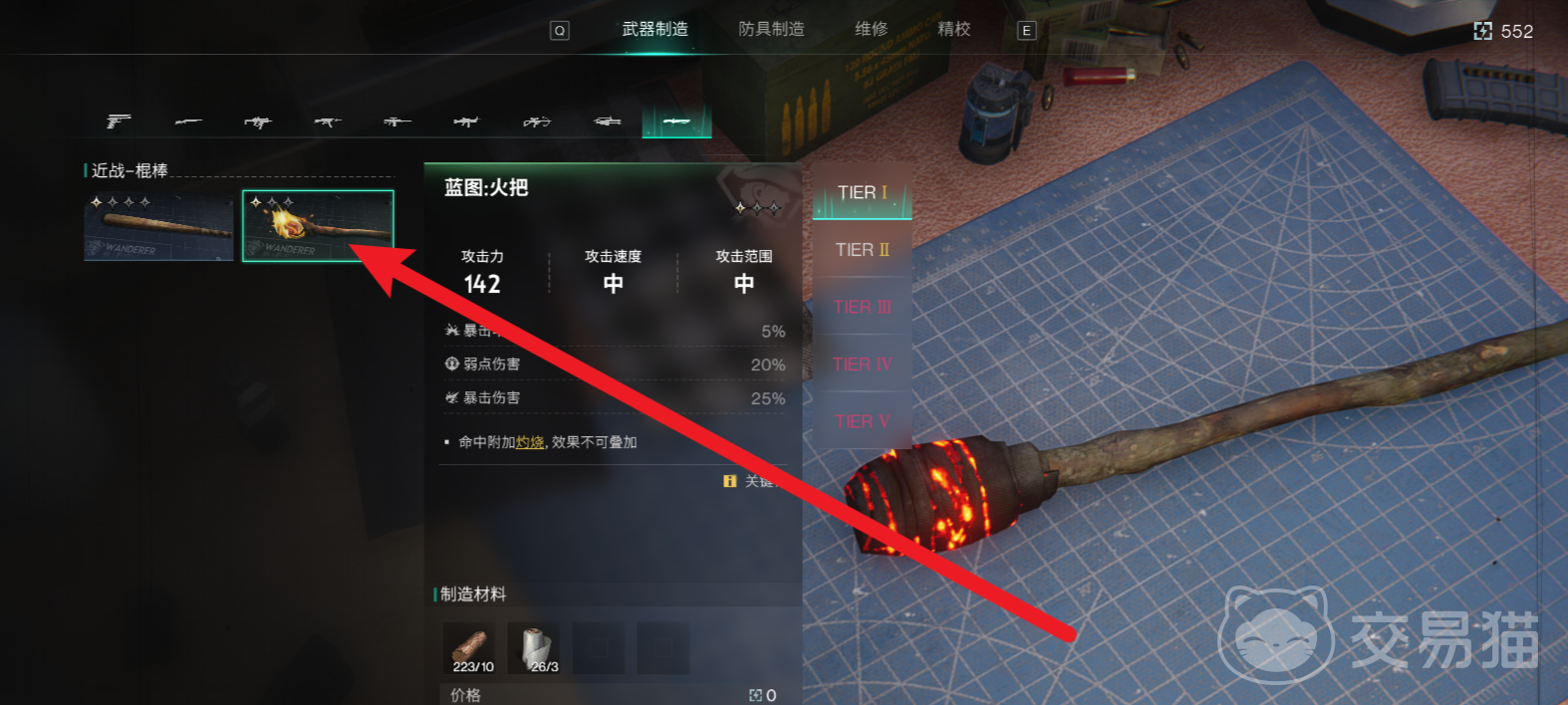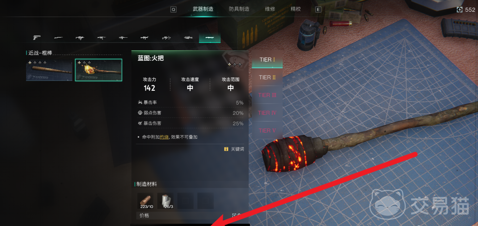 3、选择好武器制作以后就会进入到制作武器的系统中,这时大家在制作火把的时候需要先有火把的制作蓝图,如果没有蓝图的话,大家可以从武器强调中购买图纸,解锁了火把的制作方法后,在进行制作时,我们还需要收集制作火把需要用到的材料。