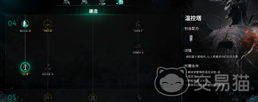 第二部分是外层防御,其科技研发时间长达四小时,在此期间玩家同样需要完成八个任务,分别为充分燃烧、石油勘探、枝繁叶茂、基因优选、动物增产、集体效应、交错冰霜、交错火焰。而完成这些任务之后,玩家会获得熵素、电池、电子元件、钢钉、铂结晶、酸液、钨锭、玻璃、铝锭这些温控塔必备的升级材料。而且还能够让温控塔优化熵素转化方式,降低熵素消耗量的30%,并且对周围的农作物生长也会进行产量的提升,且温控塔周围出生的幼崽体质较为强健,可解锁极地血脉的额外特性。