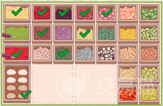 第三部分需要玩家制作一个至尊冲浪披萨,并且还要放上绿色的水果,他一共涉及到了九种食材,分别是番茄酱、芝、腊肠、猪肉粒、蘑菇,橄榄、洋葱、青椒和牛油果。