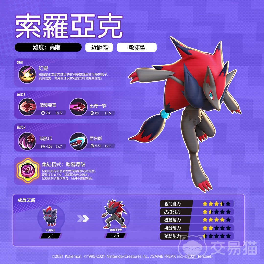 索罗亚克是一位需要精准操作和战术意识的角色。推荐指数4星,更适合承受们进行操作、收割。需充分发挥其敏捷和伤害优势,选择合适的分路和配招,也就是熟练掌握其技能机制和定位,才能在宝可梦大集结中发挥最大效力。