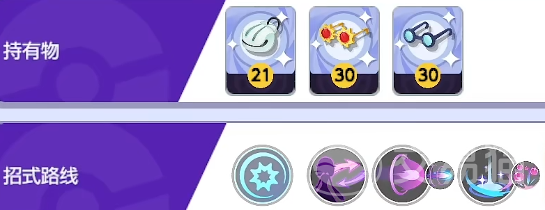 首先是持有物和徽章,徽章的话玩家们可以全部选择增加特攻的徽章。如果玩家们觉得自身的生存能力比较弱的话,也可以将其换成增加生命值的徽章。道具的话第一个选择贝壳之铃,另外两个选择眼镜和太阳镜即可。这样除了可以提高自身的特攻,还可以在造成伤害的时候回复生命力。