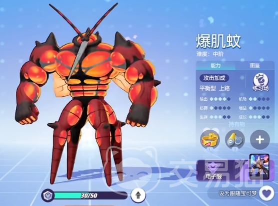 爆肌蚊作为一只近战平衡型宝可梦,本身具有的独特回血机制赋予了它在对战中持久的生命力和耐打能力,这使得它在战斗中的定位偏向于防守、开团和切入敌方后排,它的特性是每当成功打倒或协助打倒对手时,短时间内提高自身的移动速度和普通攻击的速度,此外每当使用普通攻击或特定招式命中敌人时,会累积肌肉计量槽,而如果从战斗中脱离一段时间,则肌肉计量槽会逐渐减少1格,直到清空。