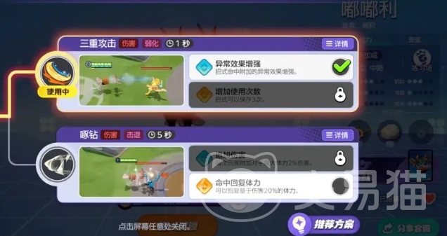 飞踢则是嘟嘟利的核心技能之一,它可以对移动摇杆方向的目标进行强力飞踢,命中障碍物或目标后会增加大量移动值,并减少飞踢的冷却时间。飞踢命中后还会向移动摇杆方向越去,落地时造成伤害和减速效果,强化后更是能造成范围眩晕,除了啄钻和飞踢的组合外,三重攻击和高速移动的组合也是一个不错的选择,当嘟嘟利面对对方控制较多,导致飞踢难以入场时,这套技能可以作为备用方案。