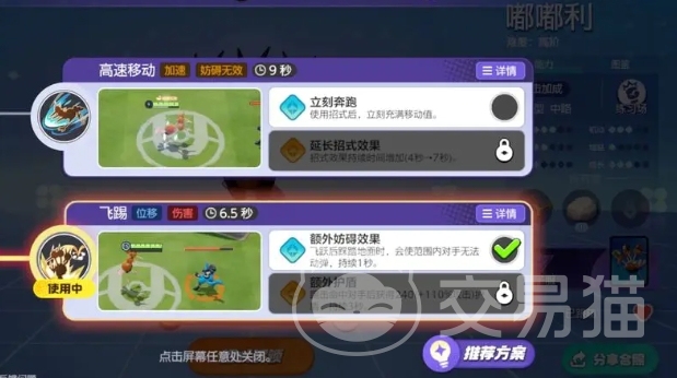 使用嘟嘟利的时候推荐在大家走中路,也可以在地图中央区域进行对战,大家可以利用他的被动技能带来的高移动速度,嘟嘟利可以在对线时有效地牵制对手,同时在团战中出其不意地进场收割或者偷分,展现出极高的上限,当附近有敌方宝可梦存在时,嘟嘟利的移动速度会得到提升,且在持续移动的过程中,体力条下方的移动值会不断累积。