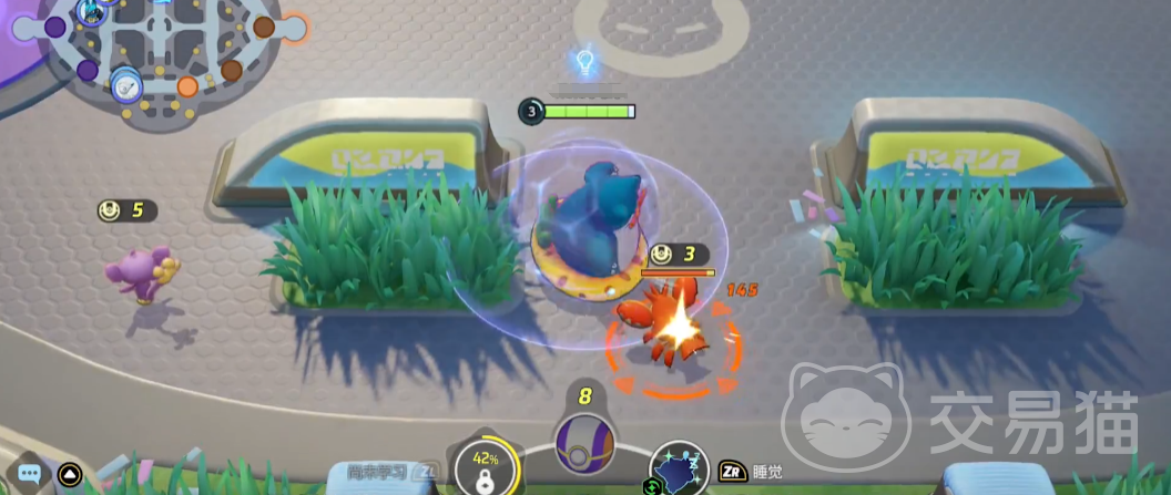 接下来是它的大招“爆睡冲击”,会在原地睡觉,对周围的敌方宝可梦造成范围物理伤害,并附带50%的减速效果,随后获得9段体力恢复效果,睡觉期间会处于妨碍无效的状态,强化之后带来伤害减免和击飞的效果。
