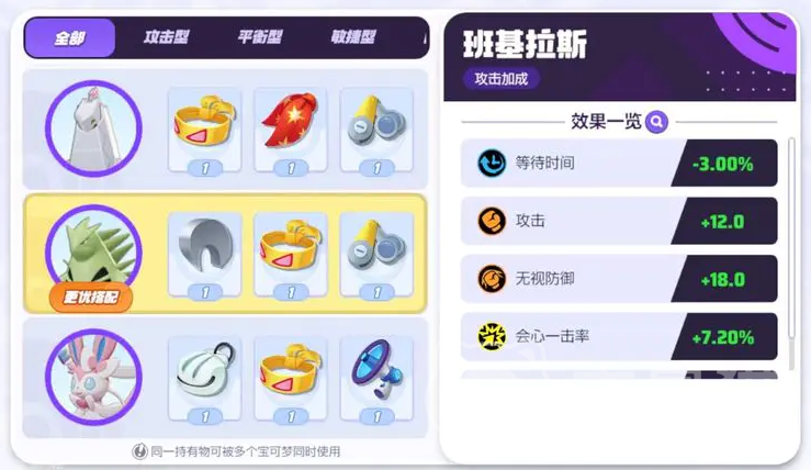 综上就是全部有关宝可梦大集结班基拉斯持有物怎么选的分享,这个宝可梦可以选择的手持物并不是只有一种,并且每个手持物带来的效果不一样,整体来说这个角色的实力还是很强的,小伙伴们可以根据自己的技术选择适合的手持物。