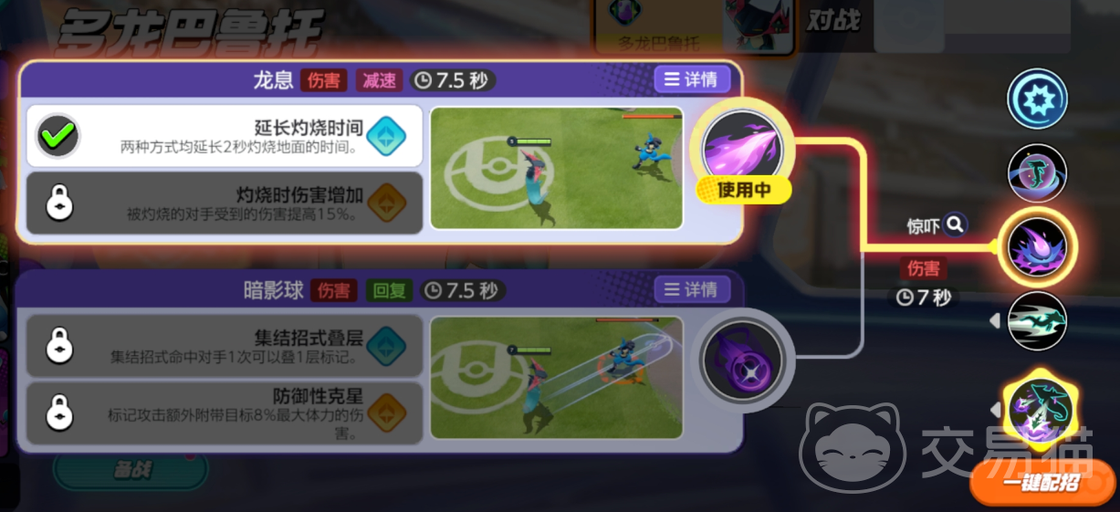 2技能“电光一闪”,短距离位并提升攻速,可以穿墙。2技能分支1“龙之舞”利用摇杆进行顺逆针和逆时针滑翔,期间可以快速发动普通攻击目标,可以重置龙息的冷却,并在滑翔时使用留下龙炎造成伤害,如果击倒了对方方宝可梦,则可以刷新龙之舞冷却,期间再次使用龙之舞则可以急停。升级可以解锁助攻刷新冷却,或是飞行期间普攻伤害提升。