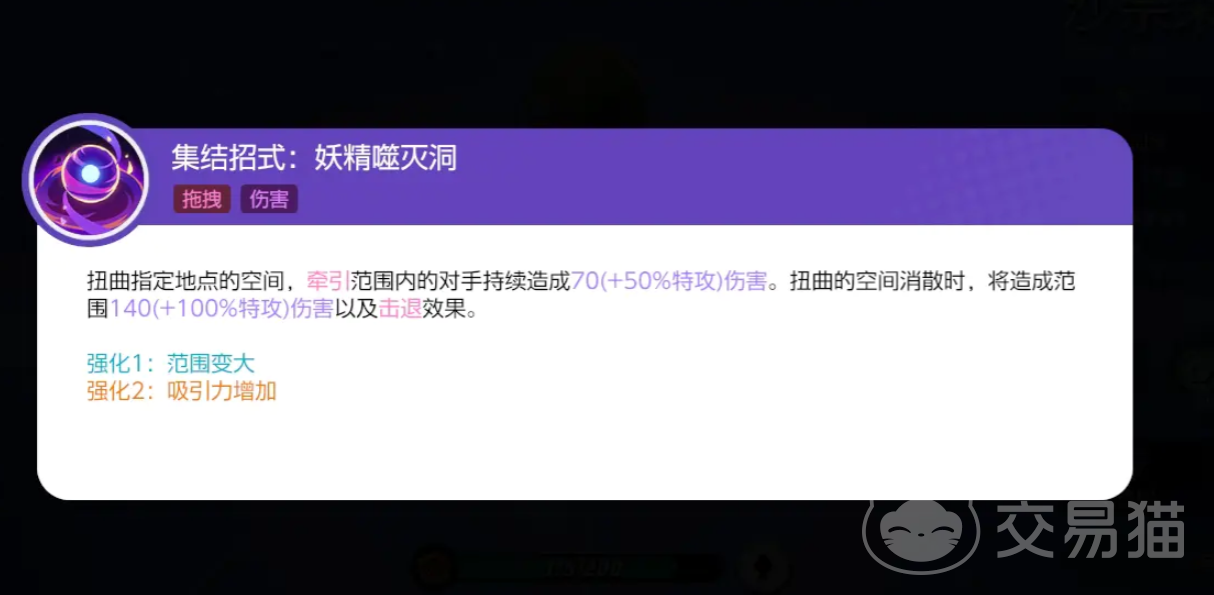它的二技能进化前可以瞬间移动并刷新一次强化普攻,进化后可选精神冲击和预知未来,精神冲击命中能缩短一、二技能的15%冷却时间并提高移速,预知未来命中能缩短该技能75%冷却提高移速,它的大招能释放一个扭曲空间,并讲范围内的敌人向黑洞中心拉拽,消散时造成伤害和击退,是大范围的强力控场技能。
