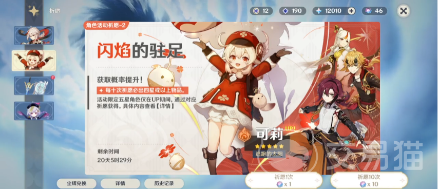 最后给大家介绍一下会进行复刻的两个角色,上面的卡池会复刻的角色是五星的可莉,可莉这个角色非常可爱,一直也很受到大家的喜欢;另一位则是阿贝多,同样也是一个五星。