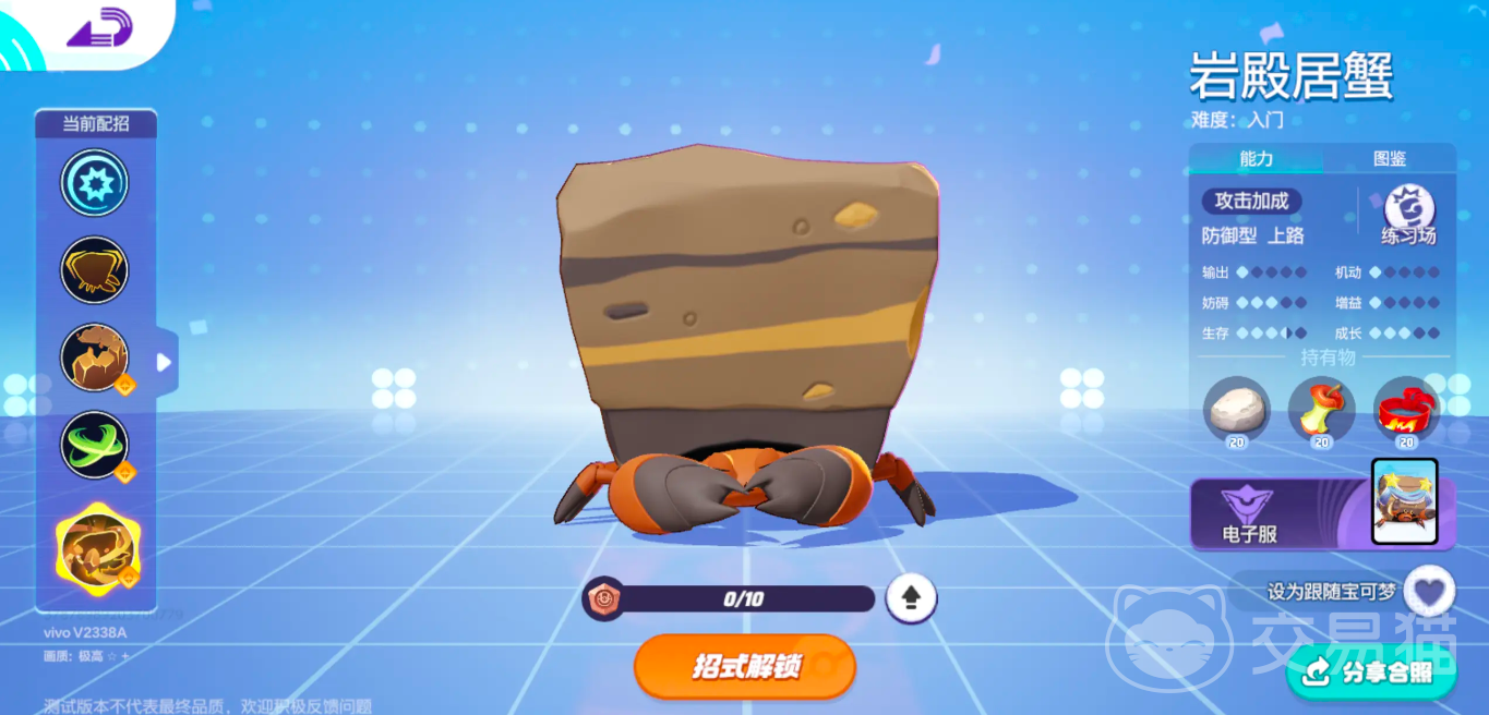 岩殿居蟹这一角色在游戏设定中属于防御型/近战宝可梦,凭借其卓越的防御力和多样化的控制技能,成为了队伍中不可或缺的前排守护者。同时,建议玩家将其部署于近战位置,以发挥其最佳的伤害输出潜力。