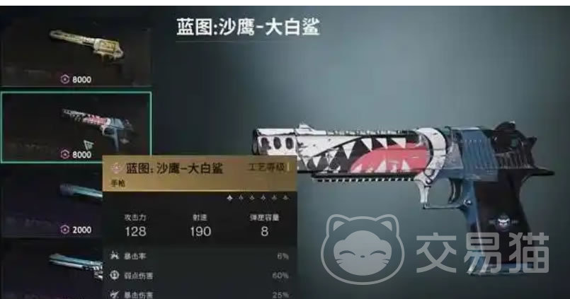第二个推荐的是受到广大玩家力荐的大口径手枪“大白鲨”;对于复杂地形下或者室内等较为狭窄的空间里,使用手枪比起远程武器如步枪、狙击枪等枪械都要好用。大白鲨也是以暴击和暴击伤害加成为主要卖点的,而堆积起的高爆杀伤力非常可观。