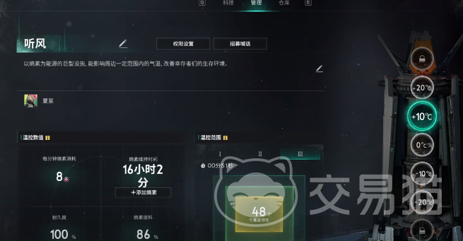 接着玩家可以进入到页面介绍,这里有仓库权限设置,还有管理权限,管理权限主要是设置温度以及研发科技。仓库权限就会涉及到仓库使用基础的功能,温控会有六档显示栏,这边就会清楚地显示一切。正常的情况下都能够满足8人小队的需求,并且温控的范围也必须要小于正常的规则。