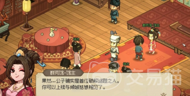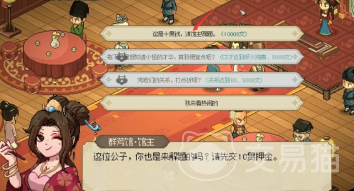 要开始这段冒险,你首先需要去到群芳馆,与那里的馆主进行一番对话。在与她交流之后,她会向你收取10贯钱,作为解谜任务的费用。注意,这个任务可是有些门槛的——如果你的音律不够出众,可是没办法进行下去哦。所以,大侠们也要赶紧提升一下自己的艺术修养。