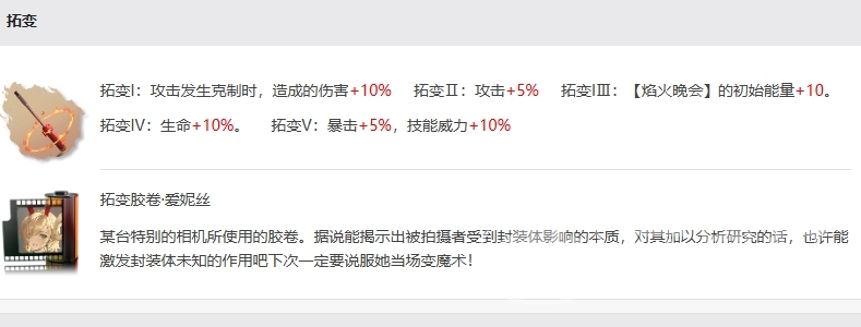 拓变IV为爱妮丝的生命值增加了10%,最后,拓变V为爱妮丝带来了暴击率增加5%和技能威力增加10%的双重提升,暴击率的增加意味着爱妮丝有更高的几率造成双倍伤害,而技能威力的提升则使得她的技能效果更加强,除了这些拓变效果外,还有一种特殊的存在是拓变胶卷,这是一卷某台特别的相机所使用的胶卷,对于爱妮丝来说,这卷胶卷记录了她与封装体的秘密联系。