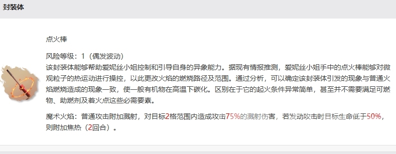 爱妮丝小姐手中的点火棒作为她的封装体,不仅是一件强大的武器,更是她控制和引导自身异象能力的关键,这根看似普通的点火棒,实则蕴含着无尽的魔力,它能够帮助爱妮丝精准地操控微观粒子的热运动,从而改变火焰的燃烧路径和范围,创造出令人惊叹的魔术火焰效果,爱妮丝手中的点火棒具有引发偶发波动的风险等级,这意味着它在发挥强大能力的同时,也伴随着一定的不确定性。