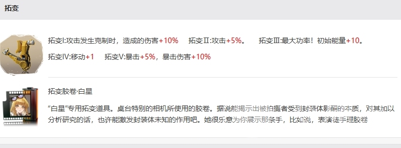 白星的拓变效果为她带来了一定的战斗优势,拓变I使得她在攻击发生克制时,造成的伤害增加10%,而拓变II则直接提升了她5%的攻击力,进一步增强了她的输出能力,拓变III是对白星重要技能最大功率的强化,使其初始能量增加10点,拓变IV为她提供了额外的移动速度加成,让她在战场上更加灵活多变,而拓变V则是对她暴击率和暴击伤害的双重提升,增加了5%的暴击率和10%的暴击伤害,这使得白星在战斗中还能更频繁地触发暴击。