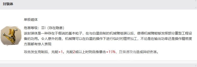 单极磁体带来的效果是在攻击发生克制后,充能+1,当充能达到2或以上时,白星自身的暴击率将增加15%,并且她的普通攻击将造成异能伤害,这一效果让白星在战斗中会有更强的爆发力,能够在短时间内造成大量的伤害。