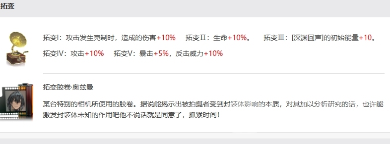 拓变I使得他在攻击发生克制时,造成的伤害能够增加10%,而拓变Ⅱ为他提供了额外的生命值加成,使他在战场上更加坚韧,能够承受更多的伤害,拓变Ⅲ则是对奥兹曼重要技能深渊回声的强化,使其初始能量增加10点,拓变IV直接提升了奥兹曼的攻击力,而拓变V则增加了他的暴击率和反击威力,使得他在战斗中不仅能够造成更高的伤害,还能在受到攻击时给予敌人有效的反击。