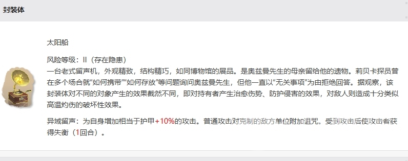 他封装体是太阳船,太阳船对不同的对象产生截然不同的效果,对于持有者奥兹曼来说,它能够带来治愈伤势、防护侵害的神奇效果,而对于敌人,则会造成类似高温灼伤的破坏性后果,太阳船还可以带来异域留声的效果,每当奥兹曼使用这一技能时,他的护甲值将增加相当于自身护甲10%的攻击力,同时他的普通攻击还会对克制的敌方单位附加诅咒效果,而当奥兹曼受到攻击时,攻击者将会获得失衡状态,进一步打乱敌人的节奏。