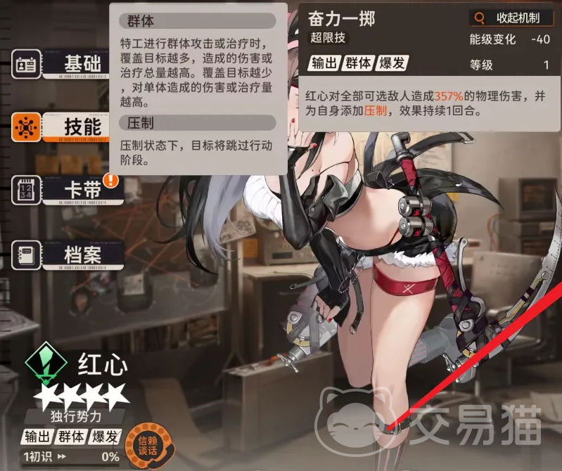 红心是一个输出类型的角色,他的爆发输出能力特别强。另外有着高额的基础生命值以及防御力,在战斗中可以优先承担大量伤害。另外攻击力同样高达数百点,可轻松消灭眼前的敌人。他平常挥舞着一把巨大的镰刀,整个人的表情十分陶醉,像是天生为战斗而生。