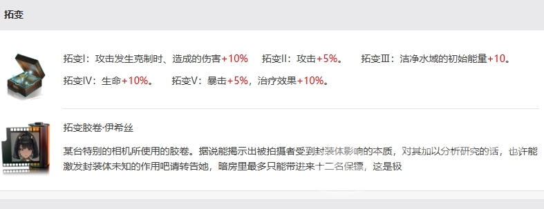 封装体还可以通过胶卷带来拓变的效果,在拓变I的时候当攻击发生克制时,造成的伤害+10%,这一拓变进一步增强了伊希丝的攻击能力,使她在面对特定敌人时能够造成更高的伤害,而拓变II的时候则带来攻击+5%的效果,这个拓变直接提升了伊希丝的基础攻击力,拓变Ⅲ带来的事对于她特色效果的增强,这个时候她洁净水域的初始能量+10,这一拓变增加了伊希丝洁净水域技能的初始能量,使她能够更快地使用该技能,为队伍提供治疗和净化效果。