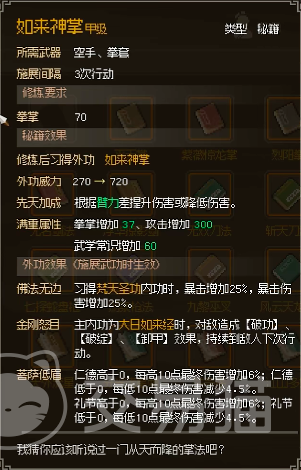 第一个小编想要介绍的就是在游戏中的一款甲级拳法——如来神掌。这款全法的外功威力是720,先天加成是臂力方面的可以提升或者是降低伤害值。在第一个词条当中是习得梵天圣功则可增加25%的暴击,这也就是说小伙伴们需要多练一个内功梵天圣功,才能够学习到完整版的如来神掌,使用出佛法无边这一招式。而梵天圣功目前获得途径有两个,一个是在释法寺打老魔头,另一个方法就是把它直接刻在石碑上可以快速拿到。在主内功当中,玩家需要学习大日如来经,不过学习大入后可能会导致其他内径无法正常使用,但是通过大日如来经可以直接进行金刚怒的世家将敌人的内功打失效。