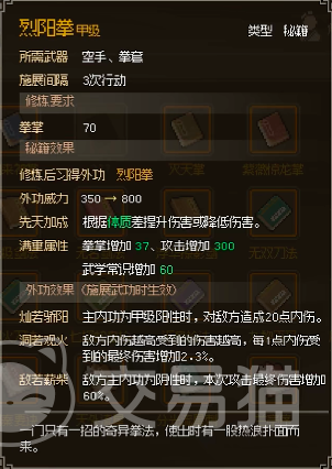 第四个是烈阳拳,这个拳法可通过走圣火宗路线来回的,通过开局选择学习的拳法或者是刻在石碑上,都可以成功拿到拳谱,这个拳法的外功威力是800,比其他的拳法功夫要高,先天加成方面的话是以体质加成为主的,第一个词条效果是如果玩家的主内功运行为甲级阳性时,可以对敌方直接造成20点的内伤,而这一词条可以看出该权法是用来打debuff的,而他的第二个词条动若观火,说明这一功法可进行自我完善,在不使用武器的状态下可对敌人造成高伤害,而且还可进行增伤。