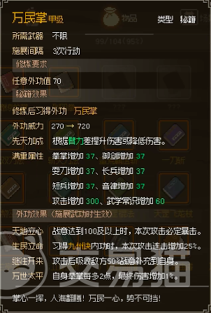 第五个推荐的掌法是万民掌,这一掌法是万老爷给的,玩家可以选择加入九流门或者是将它刻在石碑上都是可以得到这一掌法的,如果玩家将该掌法学习到满级,可增加拳掌、御剑、长兵、音律、短兵、耍刀这些技能属性都是可以进行增值的,如果玩家在开局选了心有灵犀就可以实现双倍武功值。
