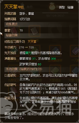 第二个是灭天掌,它的外功威力同样是720,而在他的第一个词条当中说明当主角的主内功为阴性时,攻击可以无视敌方护甲属性及效果,可选择运行儒十三经这个最强的阴性内经,而第二个词条是伤敌破气可以减敌方400~500的速度值,再加上玩家自身的道法连击,就可以直接减敌方800~1000的集气,这一效果可以说是非常厉害的,除了主角可以练这个之外,NPC角色也可以练习,在组队歼灭敌人时更加强劲。
