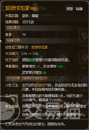 第三个是紫薇惊龙掌,玩家在做叶家军路线后,将相关的战斗情况报给康王,汇报一到三次后就可以获得紫薇惊龙掌,这个拳法的外功威力是720,可以对敏捷方面进行加成。在第一个词条当中,玩家的主内功如果是紫薇龙气,就可以在攻击敌方时,直接无视敌方格挡或者是闪避,并且自身还可实现免疫反弹伤害,这一方面的话有一些类似儒十三经,所以玩家在没有儒十三经的情况下可以先学这个拳法。如果敏捷度能够提升的话,龙动从云这个词条还是可以做到的,所以对于一些敏捷流派打法的玩家可以考虑选择学习这个拳法,主角学习这个拳法可以发挥到满威力,NPC学习该拳法的话会比较浪费,仅能提升一些敏捷值。