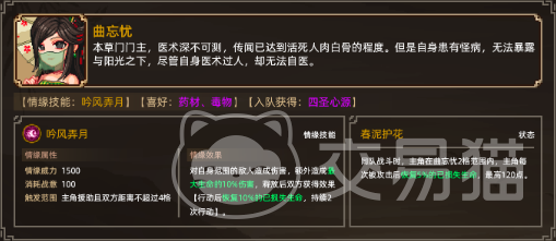 第二位是曲忘忧,他是游戏当中一位医术深不可测的本草门门主,玩家需要先前往吴越之地,进入本草门触发初次对话,解锁救人任务,每救一个人就可以获得5点的仁德和智慧,在救人任务的完成过程中会触发与邪郎中的战斗,战斗成功后则可以邀请曲忘忧入队,并且获得四心圣元,然后消耗一个三生石,则可与该角色的好感度拉满,并获得他的春泥护花状态和吟风弄月的情缘技能。
