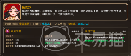 第一位女性角色就是神秘的西域舞娘曼陀罗,要想和这位高颜值女性角色结下姻缘,玩家需要先前往临安城的客栈找路人打听琼华谷的位置,这样就可以解锁曼陀罗索住的地方琼华谷,并且经过两轮大战后就可以邀请他入队,能够获得夜明珠和西域刀法。在好感拉满后即可去月老那里结缘,结缘的过程中会有一道送命题,玩家需要老老实实的回答,在结缘之后就可以解锁风情万种和金风玉露这两大技能如果不是第一个结缘的,则会没有金风玉露这个情缘技能。