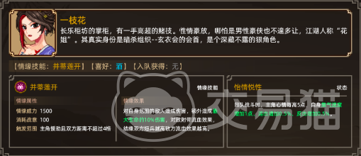 第四位是一枝花,一枝花是长乐柜坊的掌柜,有着超高的赌技。玩家需要先到大凉城的齐王府,通过初次见面选择普通行李来得罪齐王,然后再到大良城的长乐柜坊找到一枝花,并将一枝花的所有钱全部都荧光才能够触发后期的剧情,选择答应参加五日后的剧采访生死赌局,当玩家在赌局上赢得所有的前后触发战斗,和一枝花进行进一步发展,之后返回长乐柜坊邀请一枝花,之后走大地图则可触发剧情,开始战斗,选择你不走,我也不走的这一选项就可以自动结缘。